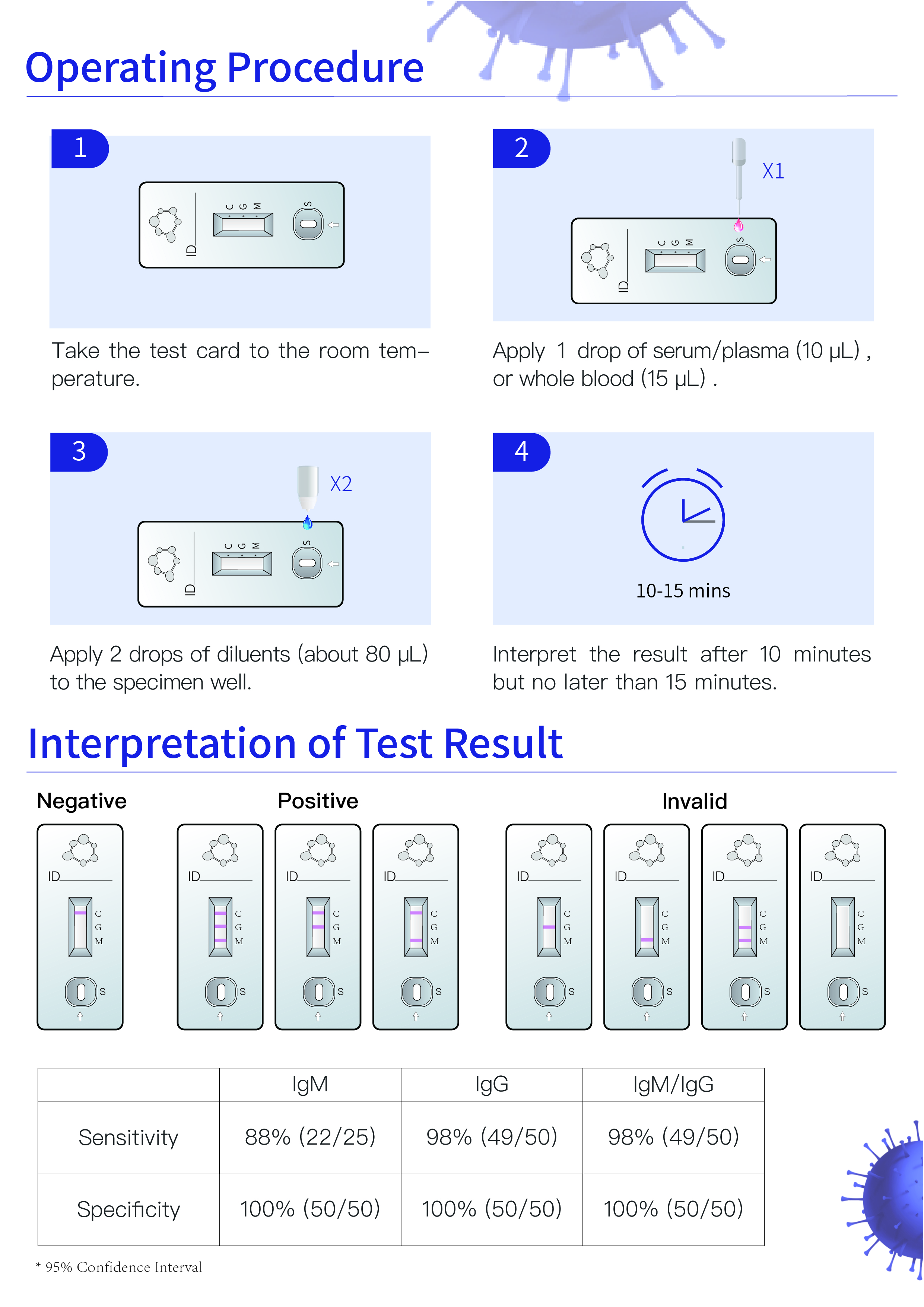 預期用途:本試劑盒用于人血清、血漿、及全血樣本中新型冠狀病毒IgM/IgG抗體的定性檢測。僅可由專業(yè)醫(yī)護人員操作使用